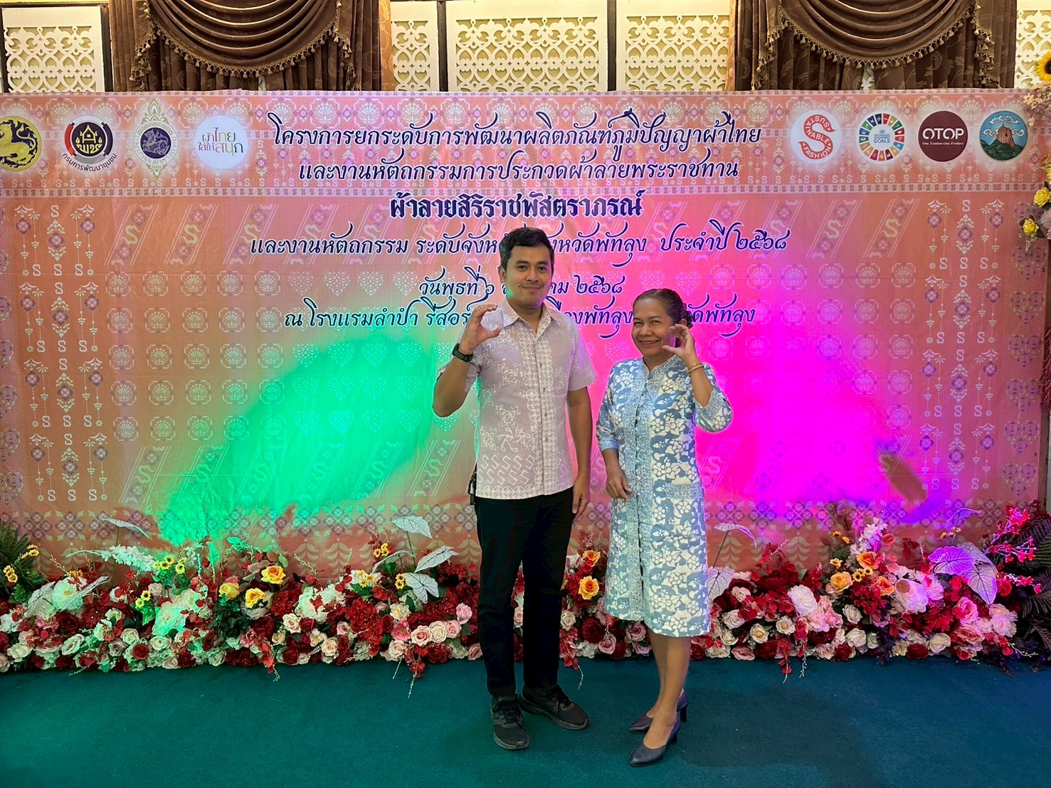 ตราภรณ์" และงานหัตถกรรม ระดับจังหวัด ?วันที่ 6 สิงหาคม 2568 เวลา 09.00 น. ณ ห้องโดม โรงแรมลำปำรีสอร์ท อำเภอเมืองพัทลุง ?นายรัฐศาสตร์ ชิดชู ผู้ว่าราชการจังหวัดพัทลุง เป็นประธาน ร่วมกับคณะกรรมการพิจารณากลั่นกรองการประกวดผ้าลายพระราชทาน “ผ้าลายสิริราชพัสตรภรณ์” และงานหัตถกรรม ประจำปี 2568 ?ในการนี้ นางจุฑาภรณ์ รักพริก พัฒนาการอำเภอศรีนครินทร์ และนายธรรมรงค์ สีอินทร์ นักวิชาการพัฒนาชุมชนปฏิบัติการ เข้าร่วมการประชุมพิจารณากลั่นกรองการประกวดผ้าลายพระราชทาน "ผ้าลายสิริราชพัสตราภรณ์" และงานหัตถกรรม ระ
