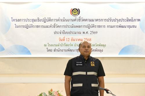 นายประโมทย์ ดำจวนลม พัฒนาการจังหวัดพัทลุง พร้อมด้วยผู้อำนวยการกลุ่มงาน พัฒนาการอำเภอ และเจ้าหน้าที่พัฒนาชุมชน จัดประชุมเชิงปฏิบัติการ “การดำเนินงานตัวชี้วัดตามมาตรการปรับปรุงประสิทธิภาพในการปฏิบัติราชการ และตัวชี้วัดการประเมินผลการปฏิบัติราชการกรมการพัฒนาชุมชน ประจำปีงบประมาณ พ.ศ. 2569” โดยได้รับเกียรติจากนายธราวุธ ช่วยเกิด รองผู้ว่าราชการจังหวัดพัทลุง เป็นประธานในพิธีเปิดและมอบนโยบายการพัฒนาเศรษฐกิจฐานราก เพื่อเป็นแนวทางในการขับเคลื่อนงานพัฒนาชุมชนของจังหวัดพัทลุง
